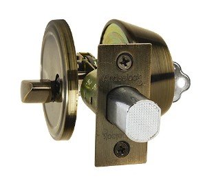 Cerrojo de seguridad para puertas de 40 a 45mm. De espesor, cilindro exterior, seguro interior, cerrojo de un pitón, acabado bronce envejecido.