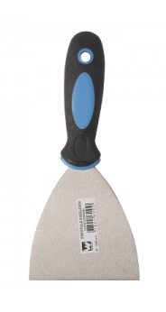 Espátula profesional de mango ergonómico de termocaucho y hoja de acero de carbono flexible, posee un baño de cromo para protegerla de la oxidación.