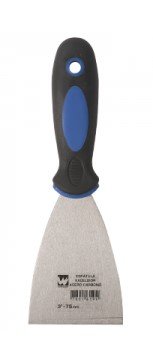 Espátula profesional de mango ergonómico de termocaucho y hoja de acero de carbono flexible, posee un baño de cromo para protegerla de la oxidación.